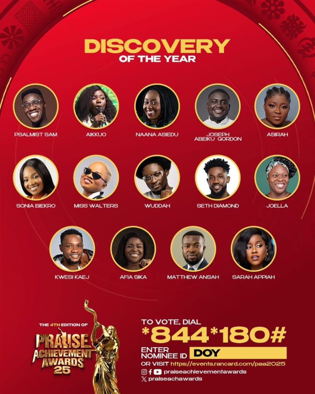 In the “Discovery of the Year” category, Asirah stands alongside other rising gospel stars including Psalmist Sam, Aikkuo, Naana Asiedu, Joseph Abeiku Gordon, Sonia Biekro, Miss Walters, Wuddah, Seth Diamond, Joella, Kwesi Kaej, Afia Sika, Matthew Ansah, and Sarah Appiah.
